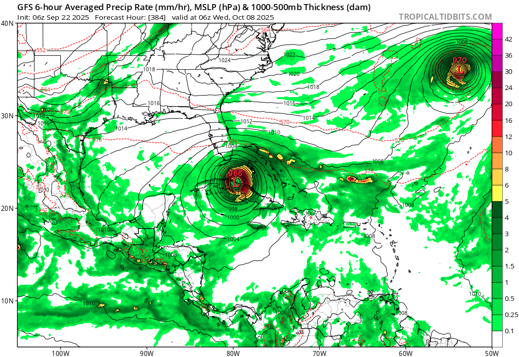 Otra del Caribe, burrada del GFS 06z 22-09-2025, claro a tropecientas horas, ciclón cuasiestacionario sobre el oriente-centro de Cuba.