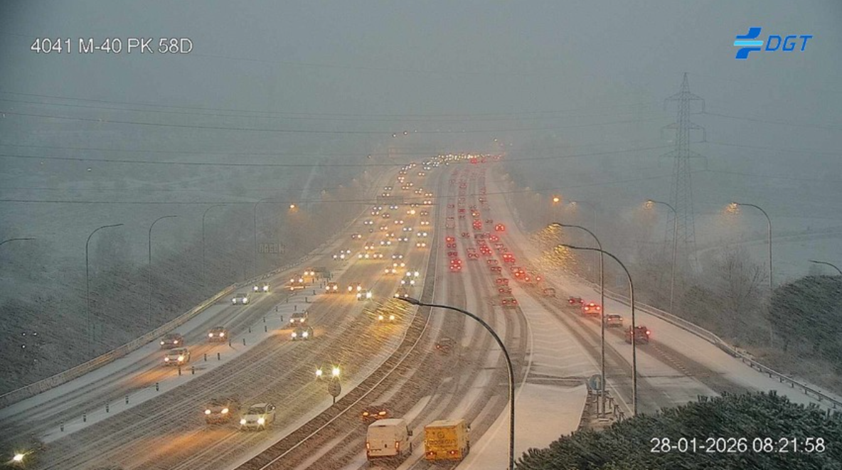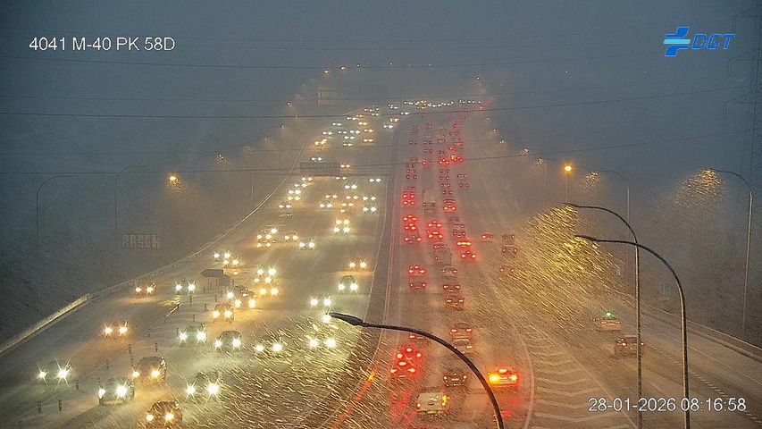 La cosa se puede poner muy complicada en la M40. Si alguien nos lee que evite esa vía de circunvalación. Instantánea 5 minutos después en el mismo sitio que colgó Tirinevoso que al haber algo más de luz se aprecia mejor cómo está cuajando.