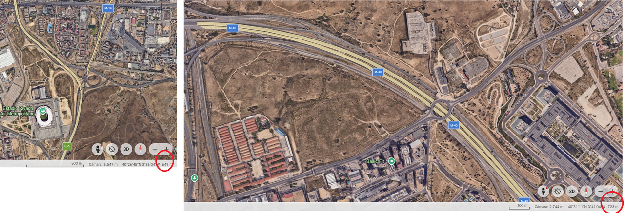 Está clara la divisoria de la nieve en la CAM. Más o menos 700-750 metros. 2 imágenes de la M40, una sin nieve (por el estadio Metropolitano) y otra con nieve (Sanchinarro). No tienen una diferencia de cota excesiva pero si lo suficiente como para que marque la diferencia en cuanto ver nieve o no catarla.