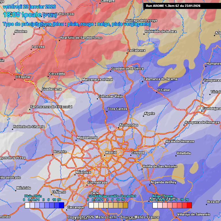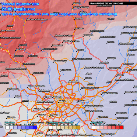 El AROME, en su línea, mucho más comedido. solo coincide con el ARPEGE en el momento de la noche cuando es más probable que podamos ver aguanieve o nieve en zonas llanas de la zonal, pero solo en eso porque el AROME lo único que ve es graupel o aguanieve como mucho afectando a la capital por ejemplo. No ve nieve en ningún momento. Y además duraría poco. Típico chubasco que consigue salvar el Sistema central. Recordar que hoy hay convección.