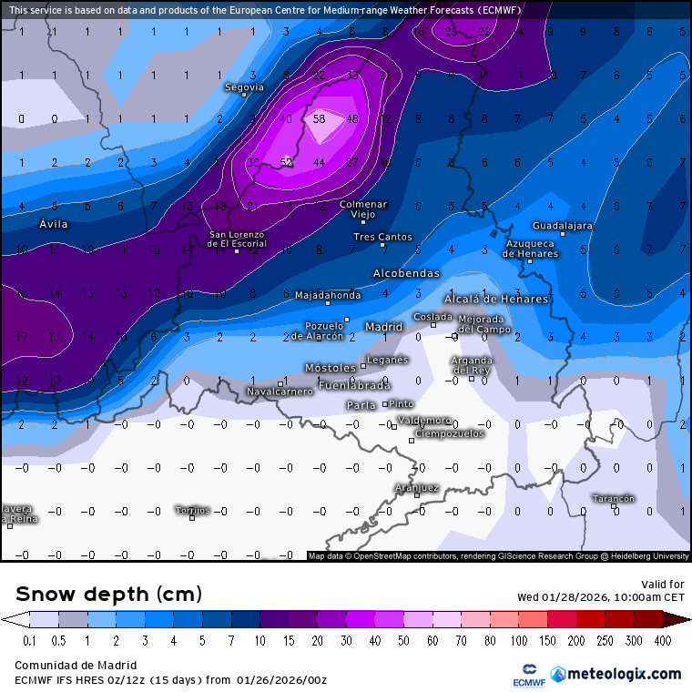 Y el europeo sigue a lo suyo, que es siendo generoso en los mapas de nieve. Este miércoles a primeras horas del día vuelve a marcarnos posibilidad de nieve o aguanieve en el llano madrileño. Es el único modelo que así lo ve de los que he mirado (no he revisado todos).