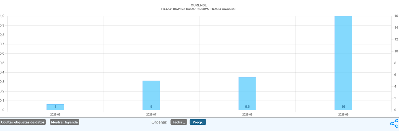 Día cubierto. Se ha animado  :viejito:  a orballar durante un par de horitas de tarde, lo justo para mojar el suelo ( no creo ni que llegue al litro....Tamallancos 0,6  y FonteFiz 0,7). En Ourense ni eso, suelo completamente seco.