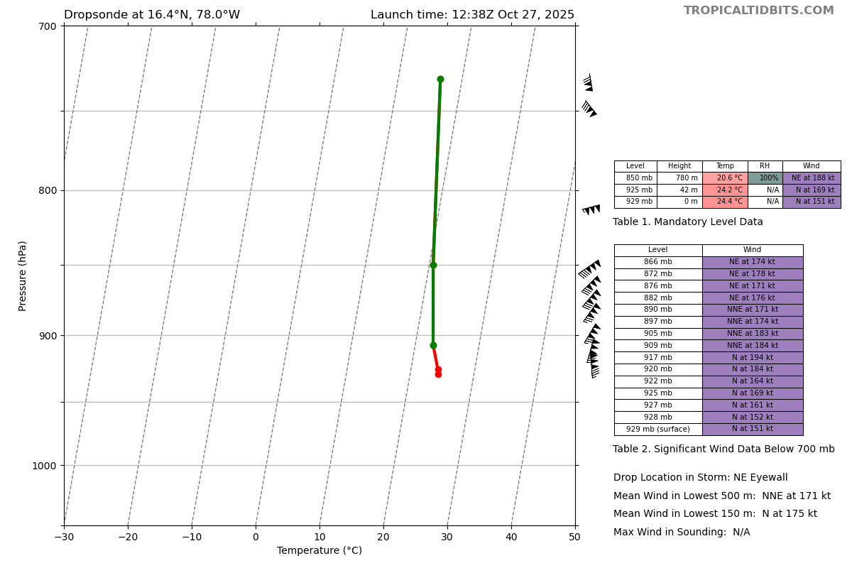 Añado otra sonda más: 151kt en superficie y 194kt a unos 150m de altura. Desde luego, si estas medidas están verificadas, los 140kt del NHC se quedan muy, muy cortos, estando la velocidad del viento máxima real entre 15 y 30kt por encima de la indicada en el parte.
