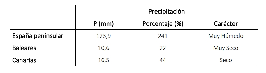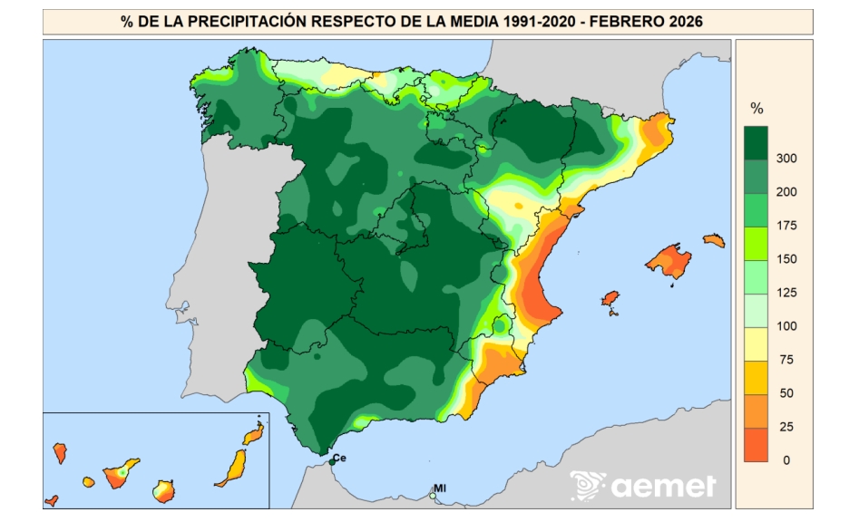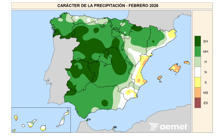 La precipitación de febrero de 2026 presentó carácter húmedo o muy húmedo en la mayor parte de la Península, con zonas de carácter extremadamente húmedo en áreas extensas de Castilla y León, oeste y este de Castilla-La Mancha, Extremadura y zonas del interior de Andalucía, el sur de Galicia y áreas del Pirineo aragonés y navarro. El carácter fue húmedo en gran parte del noroeste peninsular, la cornisa cantábrica, Galicia, la mayor parte de la Meseta Norte y amplias áreas de Andalucía y del interior oriental, así como en buena parte de Aragón y Cataluña. En contraste, el mes tuvo carácter normal en algunas áreas del valle del Ebro, el litoral mediterráneo central y sectores del sureste peninsular, mientras que resultó seco o muy seco en algunos tramos del litoral mediterráneo, especialmente en puntos del litoral de la Comunitat Valenciana y del sureste peninsular. En Baleares, febrero presentó carácter seco o muy seco en Mallorca y Menorca, mientras que en Ibiza y Formentera predominó el carácter muy seco. En Canarias, el mes fue en general normal, con algunas áreas secas o muy secas en las islas occidentales y en puntos de las islas orientales, y zonas localmente húmedas en el norte de Fuerteventura y Tenerife.