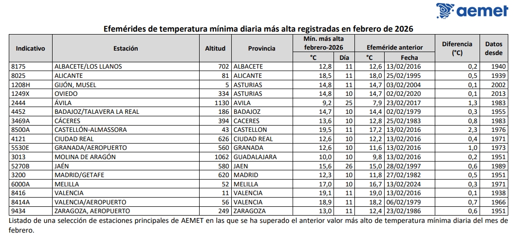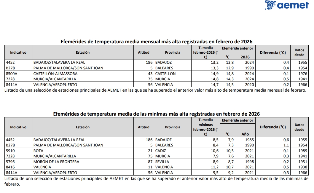 Las temperaturas máximas en febrero estuvieron 1,9 °C por encima de su valor medio en el periodo de referencia y las mínimas estuvieron +2,9 °C por encima. En cinco estaciones principales la temperatura media del mes de febrero fue la más alta de sus respectivas series históricas. Este hecho se registró en Badajoz/Talavera la Real, con 13,2 °C cuya serie que comienza en 1955; en Palma de Mallorca/aeropuerto, con 13,3 °C desde 1954; en Castellón-Almassora, con 14,9 °C desde 1976; en Murcia/Alcantarilla, con 14,8 °C desde 1941; y en Valencia/aeropuerto, con 14,7 °C cuya serie comienza en 1966. Asimismo, en otras siete estaciones principales la temperatura media de las mínimas del mes fue la más alta registrada en febrero. Estos valores se observaron en Badajoz/Talavera la Real, con 8,5 °C cuya serie comienza en 1955; Palma de Mallorca/aeropuerto, con 8,4 °C desde 1954; Rota, con 10,6 °C desde 1989; Murcia/Alcantarilla, con 7,9 °C desde 1941; Morón de la Frontera, con 8,9 °C desde 1951; Valencia, con 11,2 °C desde 1938; y Valencia/aeropuerto, con 9,5 °C desde 1966.