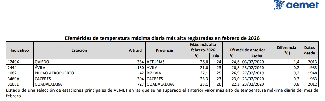 Este mes ha habido varios episodios cálidos destacables, el que más destaca por su intensidad y sobre todo por su duración ocurre entre los días 21 y 28 de febrero. Los episodios de la primera parte del mes, por el contrario, se deben sobre todo a que las temperaturas mínimas se mantienen altas, distinguiéndose los episodios cálidos entre los días 9-13, y otros dos menos intensos, entre el 4 y 6 y entre el 16 y 18 de febrero. Este febrero no ha habido episodios fríos señalables.