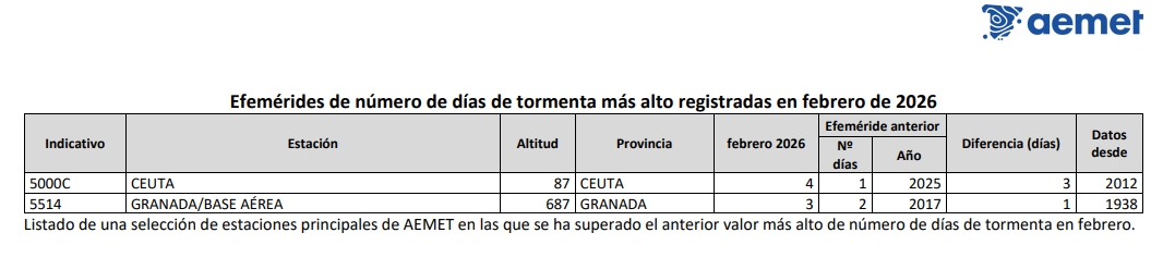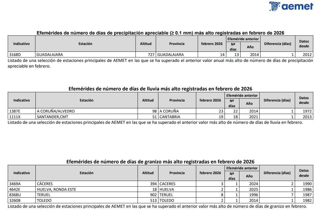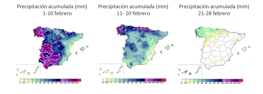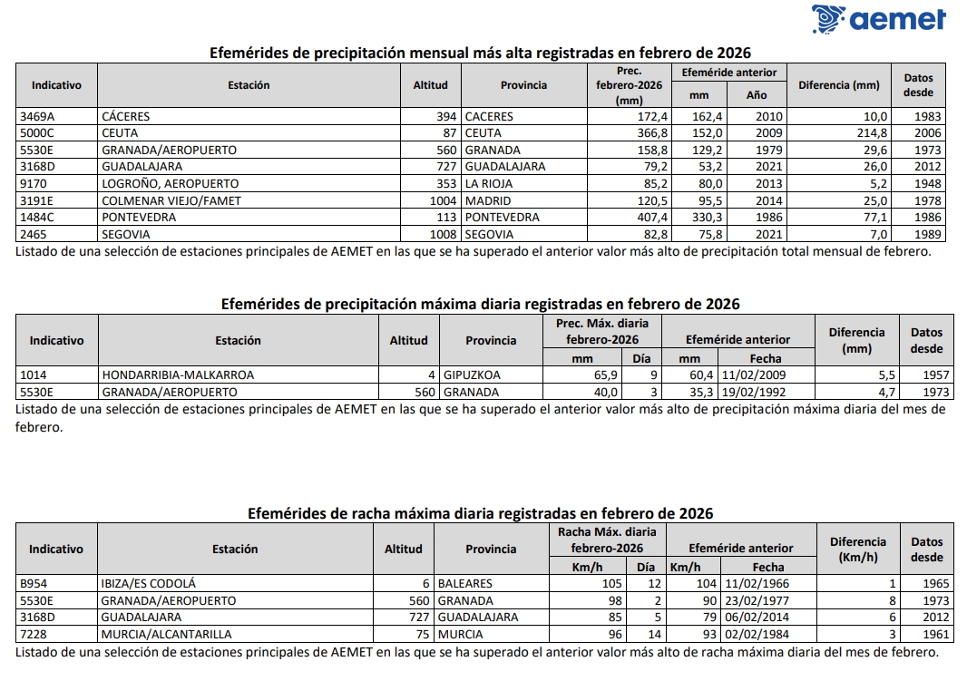 Durante el mes de febrero de 2026 se registraron precipitaciones muy abundantes y persistentes en amplias zonas del territorio. Las precipitaciones diarias máximas, registradas en estaciones principales durante febrero se observaron en Izaña, con 91 mm el día 26, seguida de Ceuta, con 80 mm el día 7, y Hondarribia-Malkarroa, con 66 mm el día 9. También destacaron Vigo/aeropuerto, con 62 mm el día 1, Donostia/San Sebastián, Igueldo, con 55 mm el día 16, Bilbao/aeropuerto, con 54 mm el día 16, Pontevedra, con 52 mm el día 1, y Santander/aeropuerto, con 52 mm el día 16. Se registraron asimismo valores significativos en Oviedo, con 47 mm el día 13, Cáceres, con 41 mm el día 4, Granada/aeropuerto, con 40 mm el día 3, Santiago de Compostela/aeropuerto, con 39 mm el día 7, Sevilla/aeropuerto, con 38 mm el día 7, Asturias/aeropuerto, con 37 mm el día 16, y Córdoba/aeropuerto, con 34 mm el día 7. En cuanto a las precipitaciones mensuales acumuladas, los valores más elevados se registraron en Vigo/aeropuerto, con 499 mm, seguido de Pontevedra, con 407 mm, Ceuta, con 367 mm, Santiago de Compostela/aeropuerto, con 351 mm, Hondarribia-Malkarroa, con 276 mm, Puerto de Navacerrada, con 255 mm, y San Sebastián/Igueldo, con 251 mm, Bilbao/aeropuerto y Ourense con 188 mm, mientras que Cáceres alcanzó 172 mm y Ponferrada 162 mm.