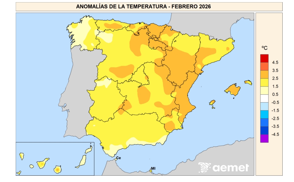 Las anomalías de temperatura en febrero estuvieron alrededor de +1°C por encima de la media en casi toda la costa andaluza, en la mitad oeste de Galicia y en algunas zonas de Extremadura y Castilla-León. Las anomalías fueron alrededor de +3°C en Baleares, Comunitat Valenciana, La Rioja, País Vasco, sur de Cataluña y Aragón, y en áreas de Asturias, Cantabria, Navarra, Murcia, de Castilla y León y Castilla-La Mancha. En el resto, la mayor parte de la península, las anomalías térmicas fueron de +2°C. En Canarias osciló entre +1°C y +3°C de unas zonas a otras.