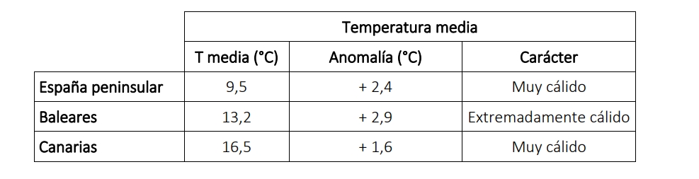 El mes de febrero ha tenido carácter muy cálido en prácticamente toda la Península, salvo en algunas zonas en el noroeste, de la costa sur y algunas áreas pequeñas del interior, que tuvieron carácter cálido. Por otra parte, febrero mostró carácter extremadamente cálido en áreas pequeñas del Levante y del interior peninsular. En Baleares tuvo un carácter entre muy cálido y extremadamente cálido. Mientras, en Canarias estuvo entre cálido y muy cálido según las zonas.