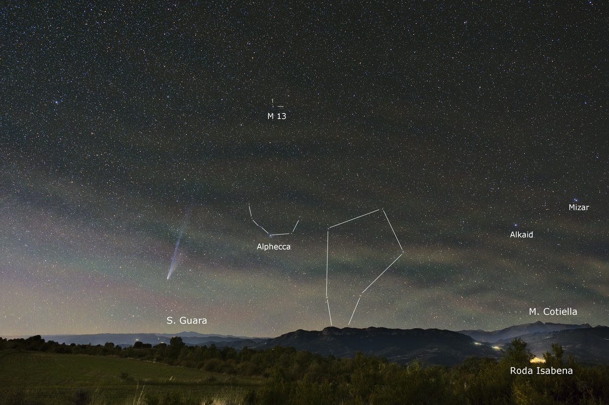 Apilando solo 4 imagenes de 30'' para sacar estrellas y cometa puntual. He hecho varios tratamientos, adjunto de menos a mas rango dinámico