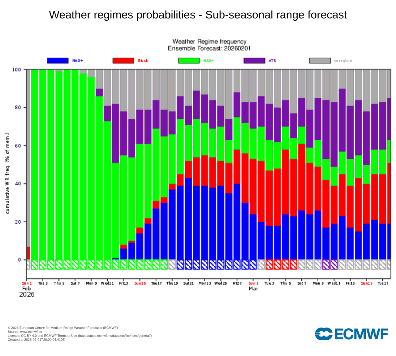 Y en el extra largo plazo, en contra de lo que podría parecer al ver la evolución que se sigue mostrando de la estratosfera con un debilitamiento evidente los próximos días que provocaría incluso su bilocación y viendo incluso como hay ya algunos escenarios del modelo europeo de rango extendido (no muchos) que marcarían una reversión de vientos en la estratosfera fruto de un posible CSE, ese mismo modelo en su gráfico de regímenes climáticos previstos para las próximas semanas no está reflejando en absoluto que eso se vaya a manifestar en Europa al menos en la troposfera provocando movimiento en forma de bloqueos desparramando el frío a latitudes más meridionales.