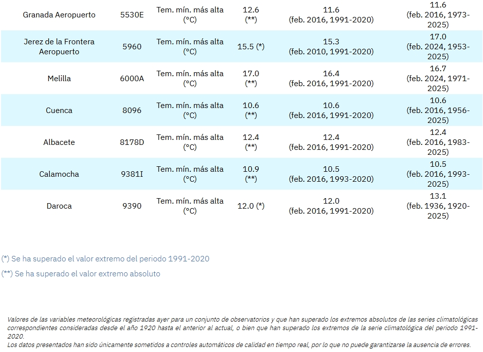 Temperaturas mínimas hoy altísimas dónde ha soplado viento, casi de récord, el febrero de 1990 un día 24 y 14° en Barcelona, 24 y 2 a Girona-Bell-lloc, 24 y 4 a Girona-aeropuerto. A la costa valenciana a las 7 ya se había llegado a 22,3 °C a Gandia por el viento de poniente. A ver si entro hoy y mañana se llega a algún lugar de la fachada oriental mediterránea española a 30 °C o una máxima similar. El récord de temperatura mínima más alta en febrero en Girona es de 15ºC el febrero de 1937, hace muchos años, el récord de máxima más alta es de 26,5ºC el 15 de febrero de 2007, no hace tanto.