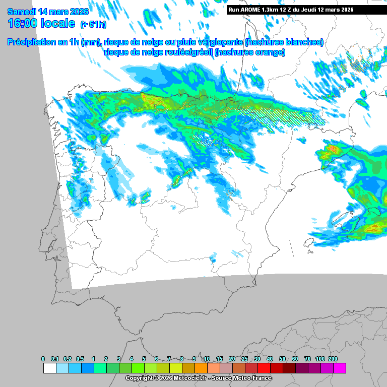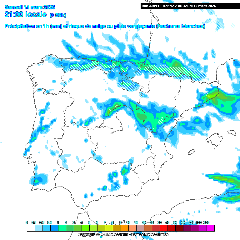 Con lo del punto de rocío suele haber una confusión, pensamos "hace 3ºC en superficie pero el punto de rocío es negativo, puede nevar". Efectivamente, el bajo punto de rocío (en realidad la baja temperatura de bulbo húmedo que puede ir asociada), ayuda a que la nieve no descongele en su caída, pero con una hr muy baja en superficie también suele ser más complicado que el 100% de hr se alcance a una altura suficientemente baja.