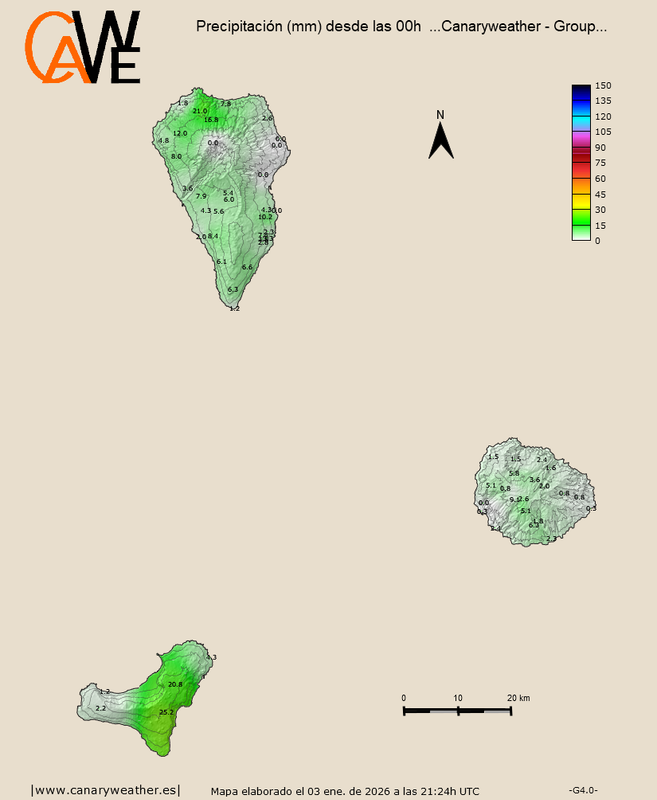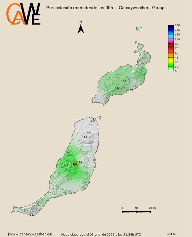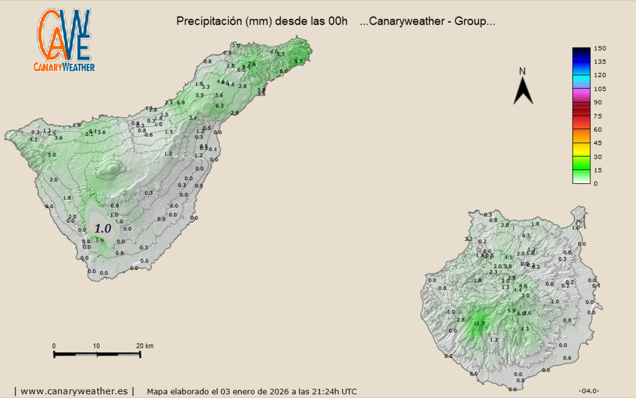 En Gran Canaria, esta situación, desde el 1 de enero, ha dejado 52mm en Aemet-Cuevas del Pinar (Tirajana) y calculo que unos 60mm en las cumbres de los macizos del suroeste. Es muy poco, pero aún así, algunos barrancos han vuelto a llevar agua.