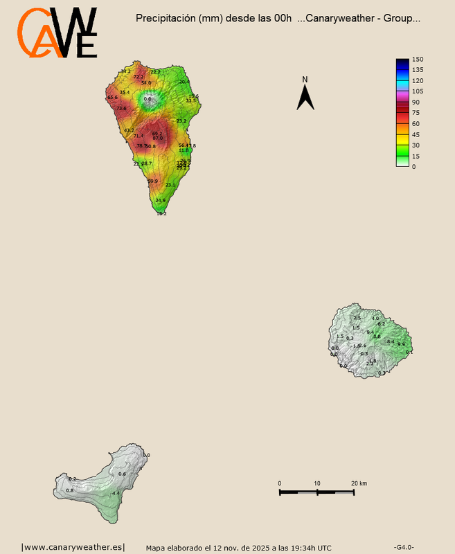 El frente está dejando excelentes acumulados en La Palma, que falta hacía, varias estaciones con +80 mm, posiblemente algún registro local de 100 mm. El barranco de las Angustias debe llevar un buen caudal como se ha visto. Ha llovido un poquito en La Gomera y El Hierro, buenos registros en el sur de Tenerife en Vilaflor y empezando en Gran Canaria.
