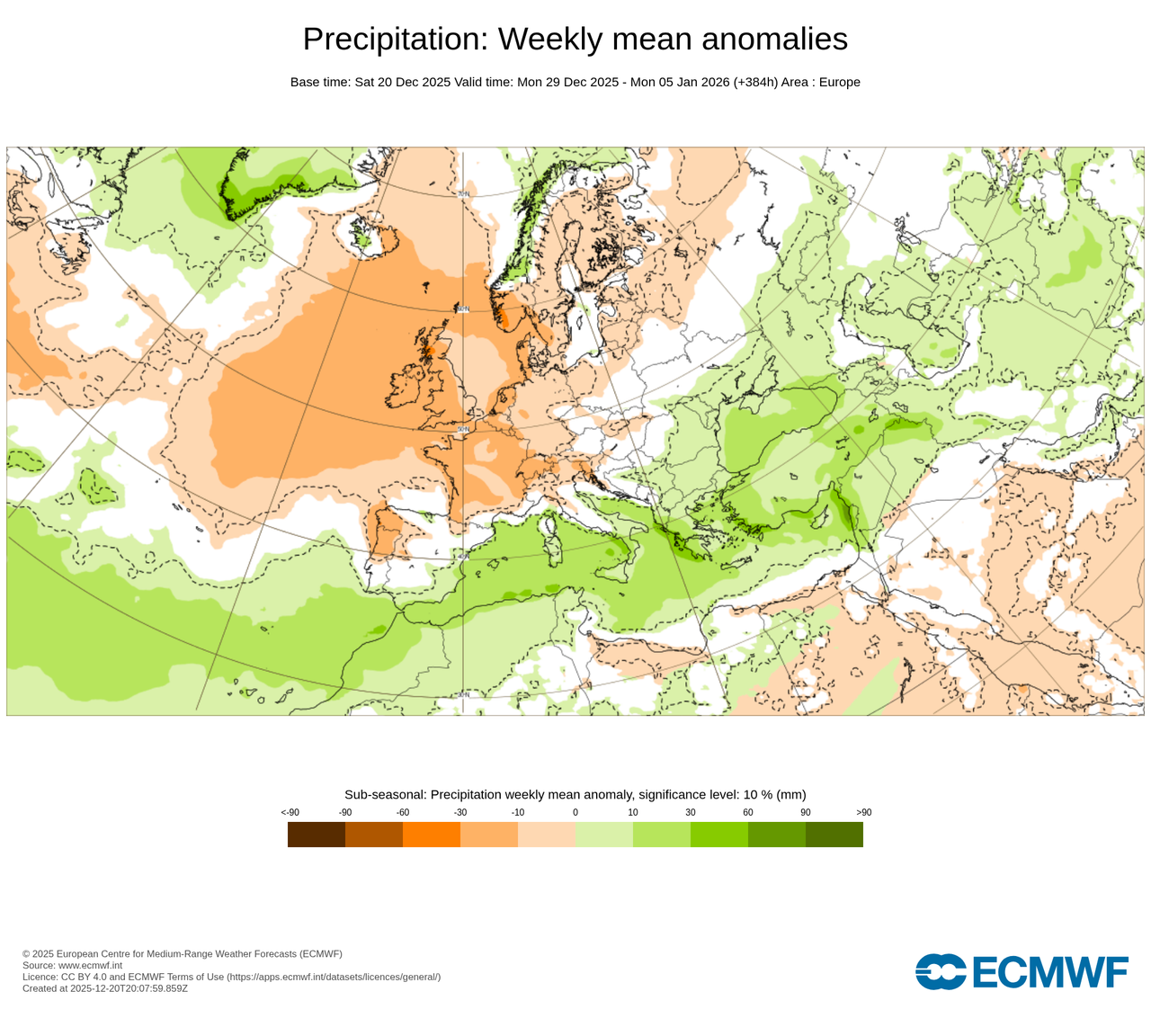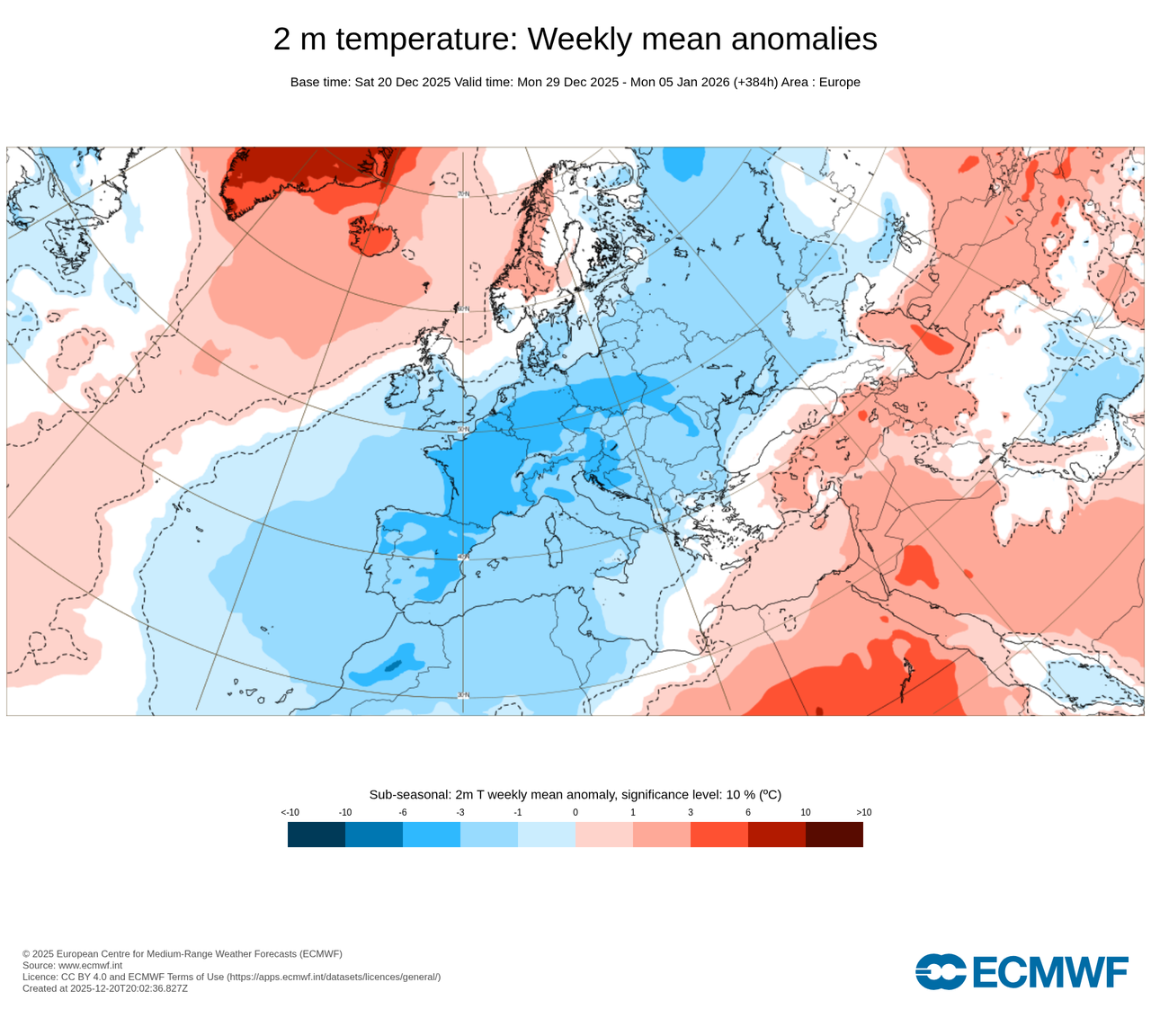 Por tanto, el vórtice estratosférico poco potente desde hace semanas sin duda favorece un serpenteo mayor del jet en la troposfera que nos puede traer lluvias o frío seco dependiendo cómo incida el jet sobre nosotros, pero no es condición suficiente para que el modelo de rango extendido europeo mantenga esa misma tendencia de anomalías de temperatura negativa en Europa occidental mucho más allá de inicios de año cuando el vórtice estratosférico quiere reorganizarse de nuevo para potenciarse. El componente azar ahí está y este año puede ser que la cara de la moneda caiga de nuestro lado y las friadas sean más probables en este lado del globo y menos en otros.