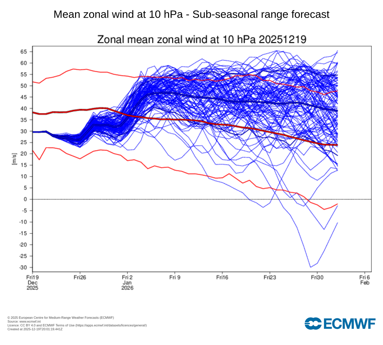 Hay algo obvio, hay poca potencia zonal, tanto en la estratosfera como en la troposfera. La primera influye sobre la segunda. Desde hace semanas el viento zonal en la estratosfera (a 10 hPa en el paralelo 60N)  está por debajo de su media climática y sigue ahí hasta primeros de enero cuando presumiblemente se recuperaría algo situándose entonces por encima de su media climática. Esa poca potencia zonal en la estratosfera como digo lleva muchas semanas así, algo que he visto pocas veces. En ningún caso se ha producido un CSE en estas semanas que es lo que todo el mundo asocia con eventos de frío pata negra, donde se revierte el viento zonal en la estratosfera que provoca desalojos de frío hacia latitudes meridionales. En esta ocasión sin CSE el serpenteo del jet está en modo on favoreciendo esos ascensos de la dorsal y descensos de masas frías que podrían desencadenar una invernada curiosa en algunas zonas de Europa occidental de cara a los últimos días del año y primeros del siguiente.