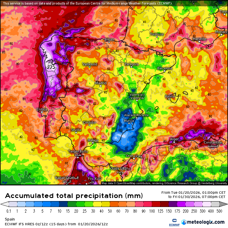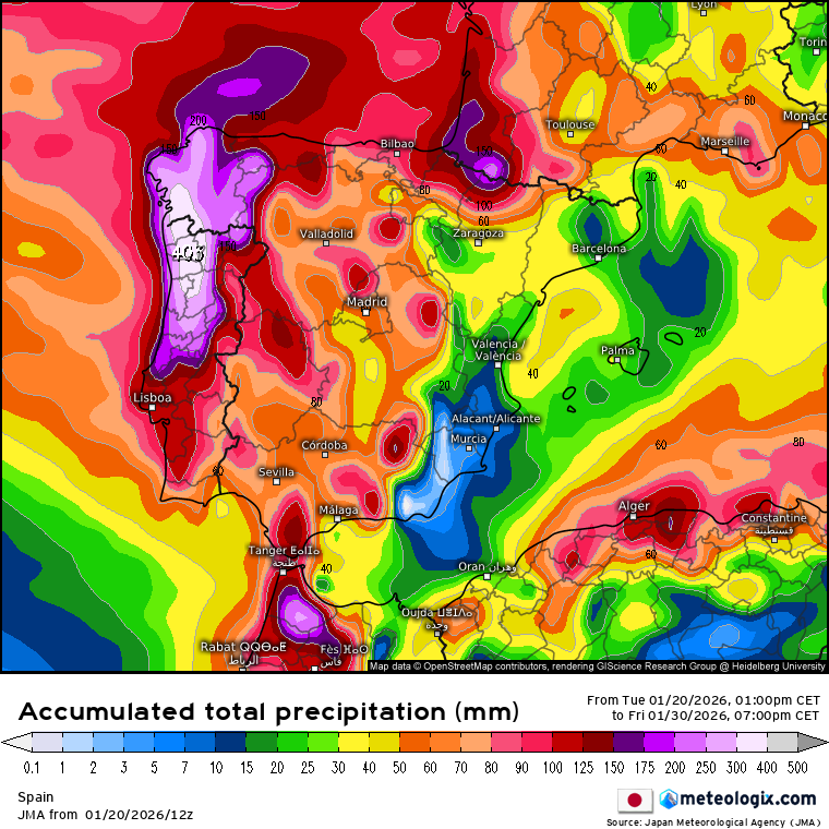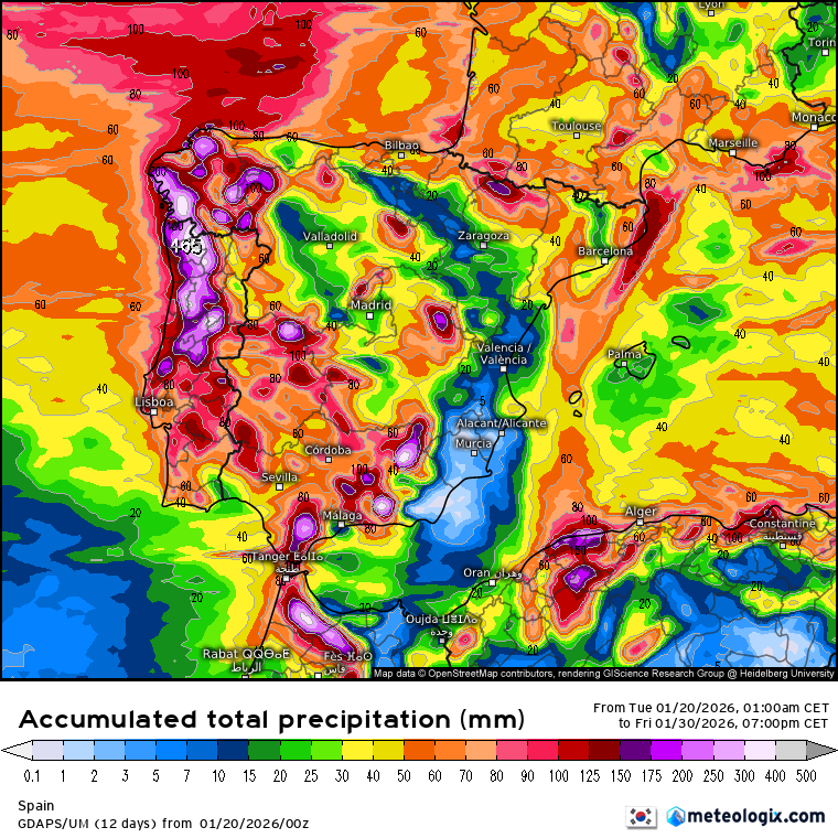 Distintos modelos pero con registros igualmente espectaculares fluctuando entre 400 y 500 mm entre el norte de Portugal y sur de Galicia para los próximos 10 días.