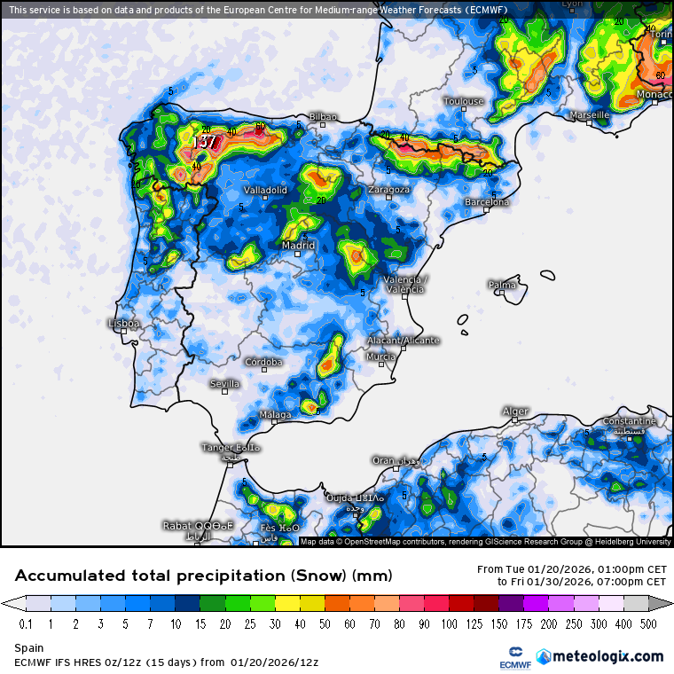 Aquí, para Guadalajara capital, me gustan mucho los oestes, no necesariamente porque nos vayan a dar nieve (es un viento procedente de Madrid, caldeado) pero sí mucho agua. Creo que la cota de nieve no bajará de 800 ó 900 msnm. El tema es que con desplomes podría pasar como con Zamora o Valladolid, ciudades más o menos a la misma altitud que Guadalajara, y podría llegara a verse agua-nieve o todo nieve muy puntualmente. Estará interesante el seguimiento.