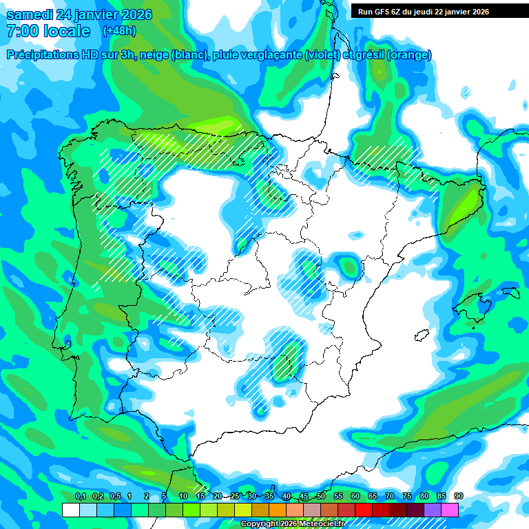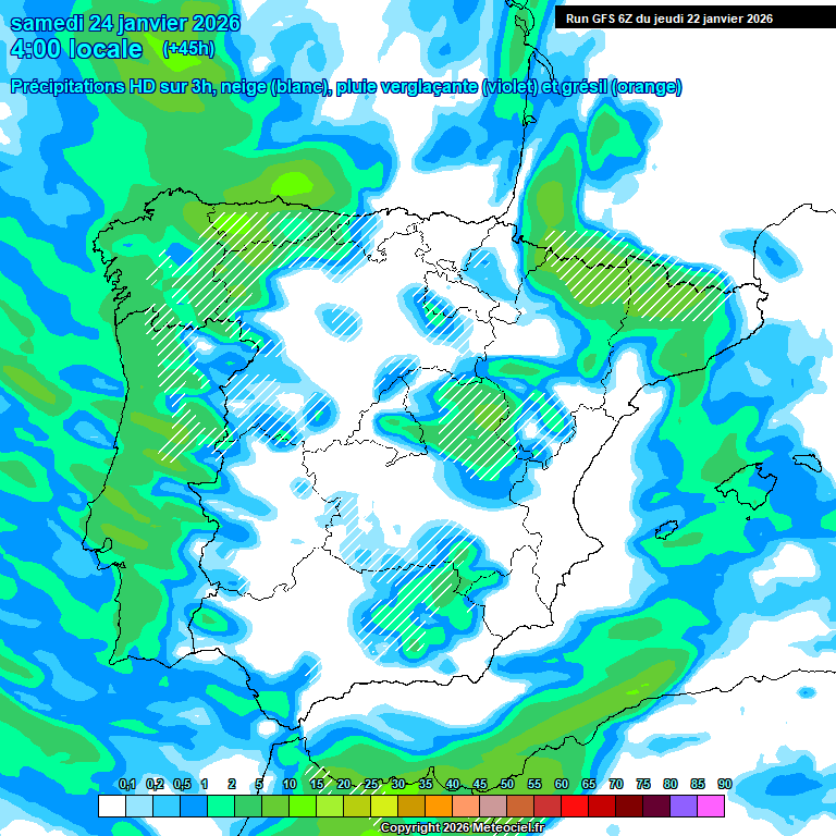 Si sumamos el granizo y nieve granulada, la extensión es algo mayor, y se aprecia perfectamente el límite de precipitación en el Cantábrico, que no pasaría del Occidente y SurOccidente de Asturias: