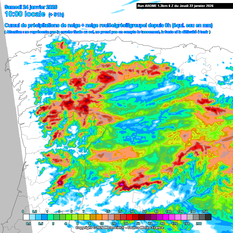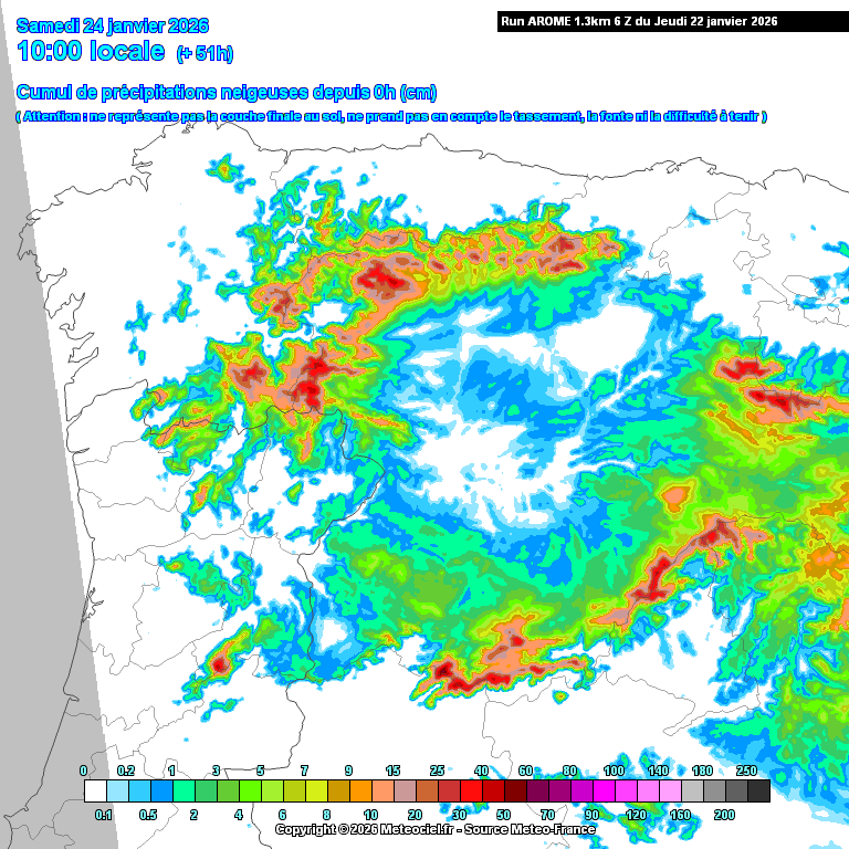 Los mesoescalares, al menos el Arome, vienen algo más secos que lo inicialmente previsto para mañana. Acumulados de nieve hasta la sábado por la mañana: