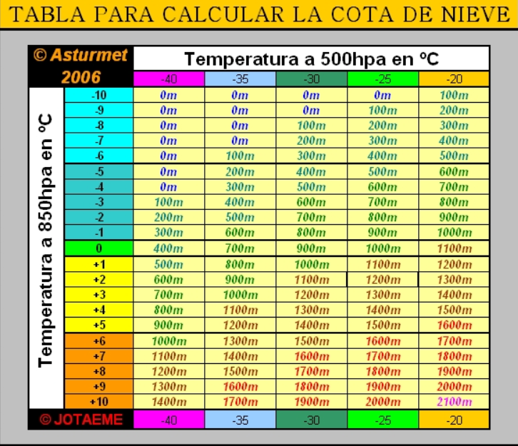 Adjunto 2 tablas de cotas de nieve, que no introduce el parámetro de geopotencial que es clave para saber a partir de qué cota puede nevar. Pongo las 2 porque hay diferencias sustanciales entre ambas lo que indica la dificultad de pronosticar la cota de nieve.