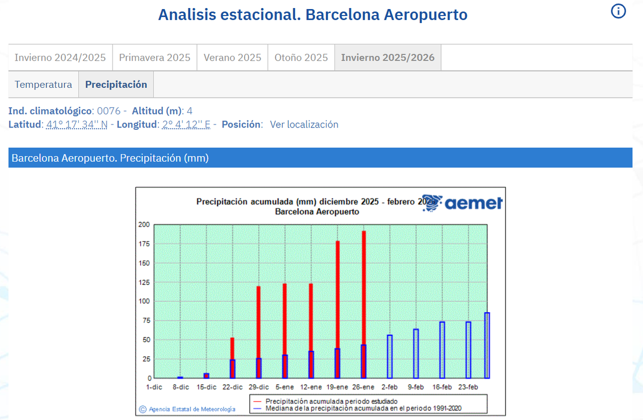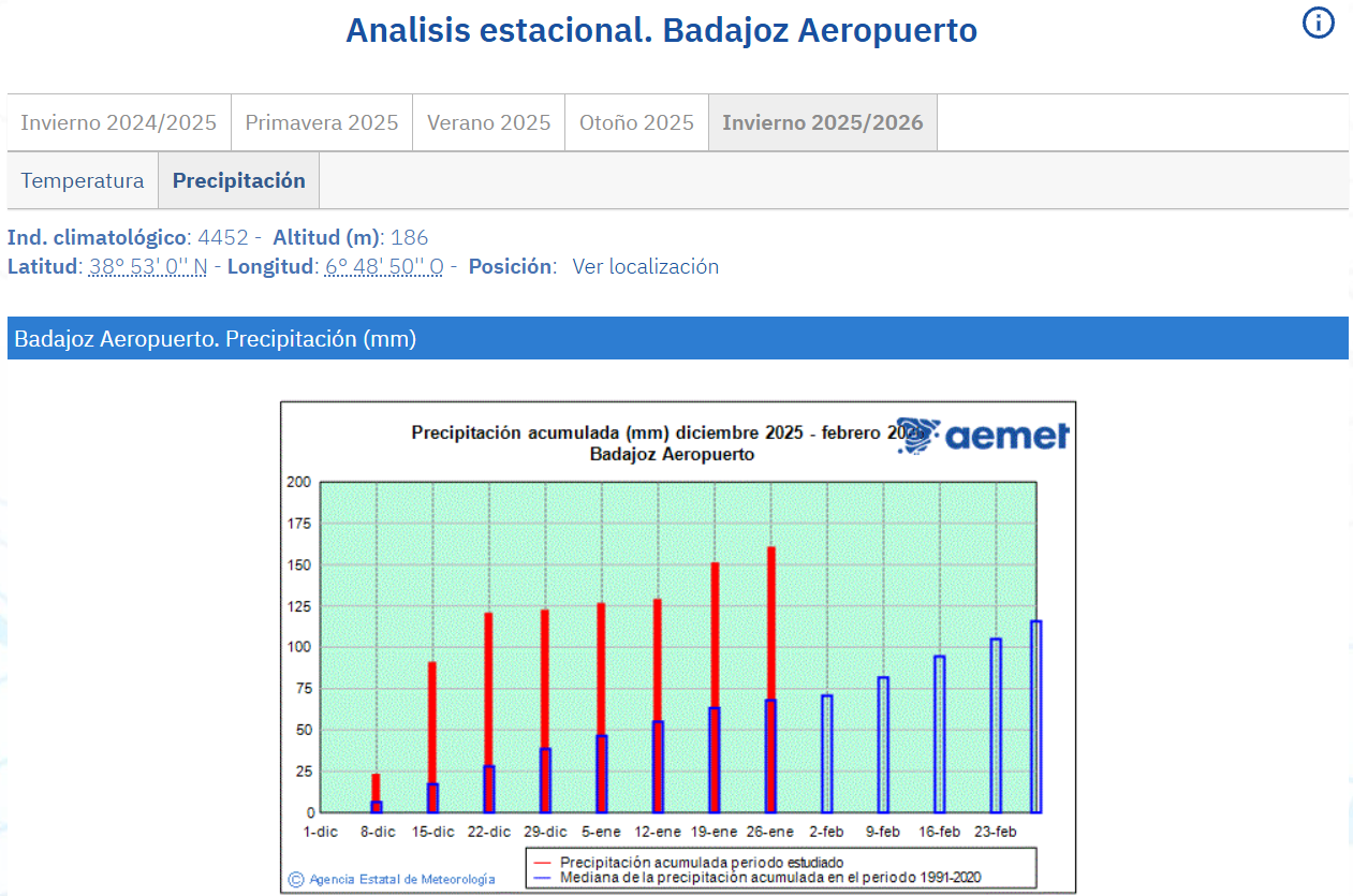 Solo un pequeño inciso. El análisis estacional de la AEMET está muy bien para hacerse una idea de como está comportándose el invierno, tanto en precipitaciones como en temperaturas, en un vistazo rápido. Pero deberían echarle un ojo al producto. Huelva Ronda Este tiene una media en el trimestre diciembre-febrero de 220 mm (99 mm diciembre; 71 mm enero y 50 mm febrero), con lo cual, no se entiende que la barra de precipitaciones que marca la media acumulada del trimestre, en su último tramo, se quede por debajo de 150 mm. Lleva claramente a engaño. Con Sevilla - Aeropuerto pasa exactamente lo mismo. Así que entiendo que será extensible a las demás gráficas de análisis de otras estaciones.