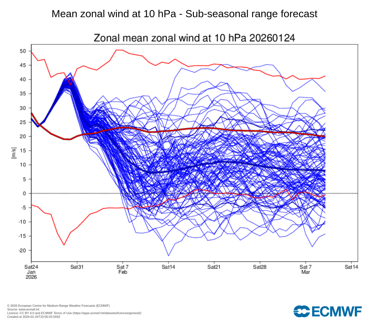 Vemos como hasta la primera semana de febrero incluida la media de escenarios de los ENS del modelo europeo de rango extendido sitúan el viento zonal a 10 hPa por encima de su media climática a latitud 60 N al menos que es lo que representa ese gráfico, aunque ya desde inicios de febrero comenzaría a descender desde el pico de potencia que lo situaría en su percentil 95 justo a finales del mes de enero. A partir de esa bajada de potencia del viento zonal a 10 hPa en el paralelo 60N se mantendría así por debajo de su media climática presumiblemente según ese modelo hasta el final de su pronóstico en la primea semana de marzo.