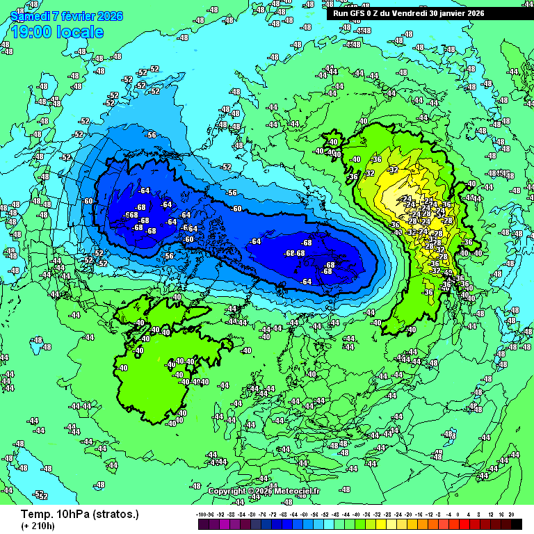 Estratosfera, GFS, viernes 11, fuerte simetría manteniendo el ángulo mostrado días atrás, con centro geométrico algo más desplazado al centro polar: