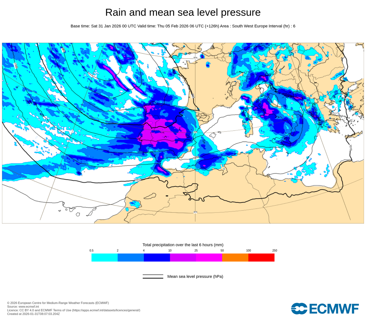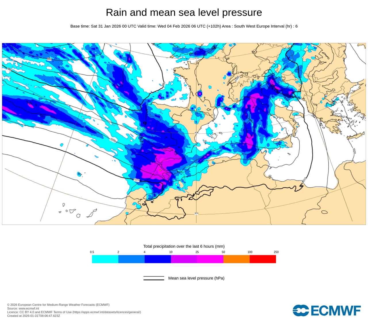 - El miércoles 4 de febrero a las 6 de la mañana nos marca esos acumulados en 6 horas. Cuando aparecen esos colores morados o granates es que son cantidades ya respetables que pueden dar problemas viniendo de donde venimos_