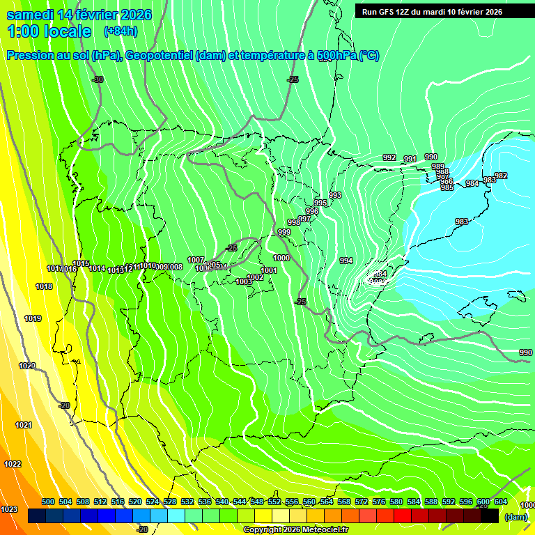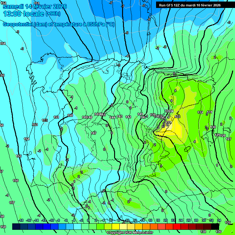 Europeo, que al final se ha llevado el ascua a su sardina, meso baja entrando por Portugal norte con sus máximos de vientos en su cara sur (isobaras más apretadas) y la entrada más cálida y húmeda más al sur aún.  A 850 hPa: