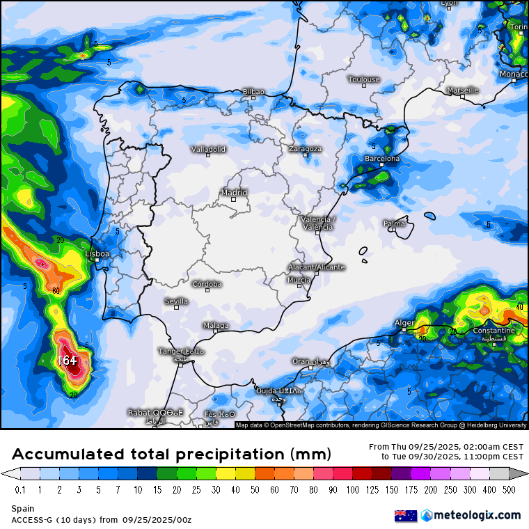 Abrazada por la dorsal y sin frío destacado en altura está claro que Gabrielle lo tiene difícil para poder darnos litradas destacadas cuando llegue al suroeste peninsular, pero aún así parece claro que unos cuantos litros dejará en acumulados en algún punto concreto que está por determinar en estos momentos.