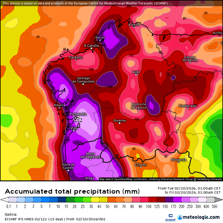 Ahora bien, en las próximas semanas algunos puntos de Galicia puede ser que acaben superando a Grazalema, como por otra parte es lo normal desde el punto de vista climatológico, si volvemos a nuestra normalidad climática con Galicia recibiendo entre 200-300 mm cada 10 días en sus zonas más proclives y menos ya por Grazalema (del orden de 100-125 mm los modelos más generosos y unos 70 mm los más rácanos en los próximos 10 días). Ejemplo lo que muestra el IFS para los próximos 10 días para Galicia: