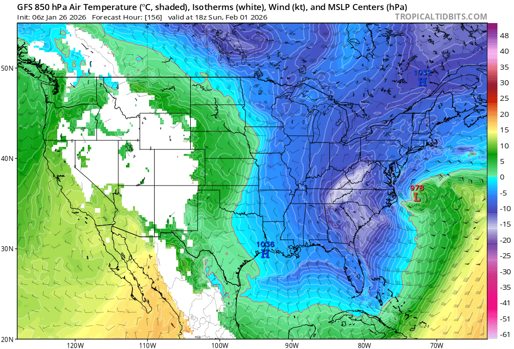 Después de mi último post las temperaturas ha subido sensiblemente acá por el centro de Cuba mientras el viento ha ido girando y ya es de componente sur claro, hoy máximas de 30-31°C, mientras el el Golfo de México avanza un nuevo frente, el mismo que está asociado a la tormenta invernal en los Estados Unidos. Increíble que hace 4 días (el pasado miércoles) las temperaturas subieron casi 10°C respecto al día anterior y hubo convención producto a la convergencia de las brisas que generó algunas tormentas al interior de la isla con acumulados puntuales de hasta 100mm, eso en enero es rarisimo. El frente llegará mañana al occidente de Cuba ( a mi zona en la parte más occidental del centro llegará ya en la noche de mañana) y dejará varios días muy invernales nuevamente.