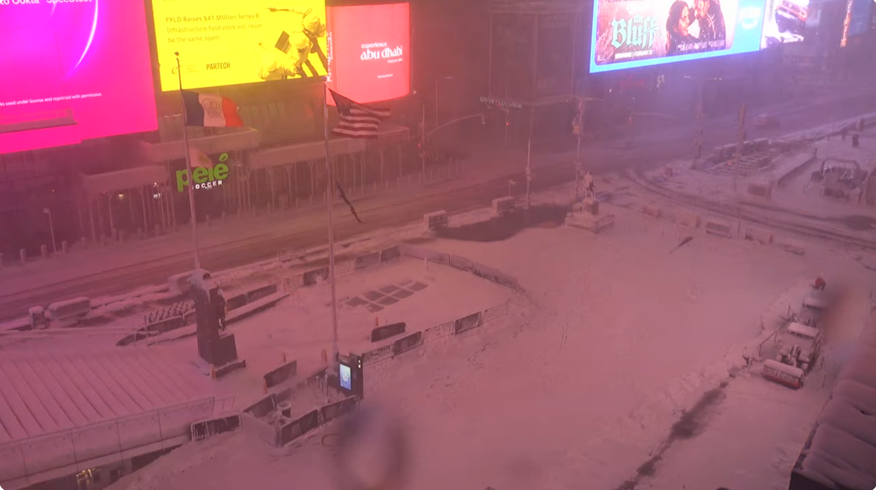 La imagen sacada de una de las webcam de Nueva York es mala porque es un pantallazo y además es de noche todavía, pero se aprecia por las banderas que sopla el viento y aunque no se ve en la imagen está nevando moderadamente al menos en el momento que hice el pantallazo.