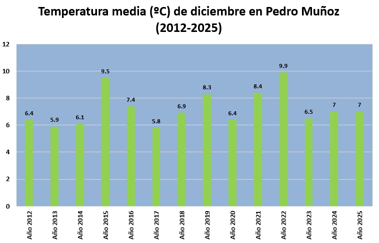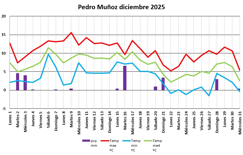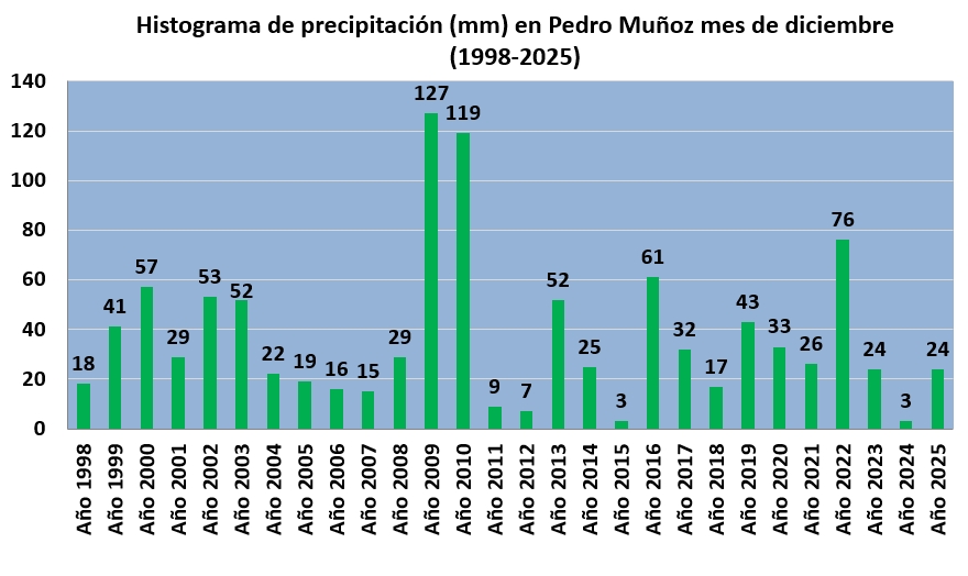 Diciembre del 2025 registró en Pedro Muñoz una precipitación de 24 mm resultando un mes seco respecto a la serie que dio comienzo en 1998.